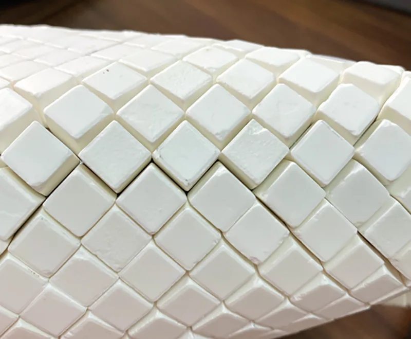 За внатрешни облоги во заоблени цевки, 【алумина керамички мозаик подлоги отпорни на абење】 претставуваат одличен избор. Овие перничиња обично се врзуваат за хартија или мрежести подлоги, овозможувајќи брза и ефикасна инсталација на заоблени челични површини користејќи епоксидно лепило. Ова ефикасно го спречува абењето на челичните цевки предизвикано од протокот на материјалот.